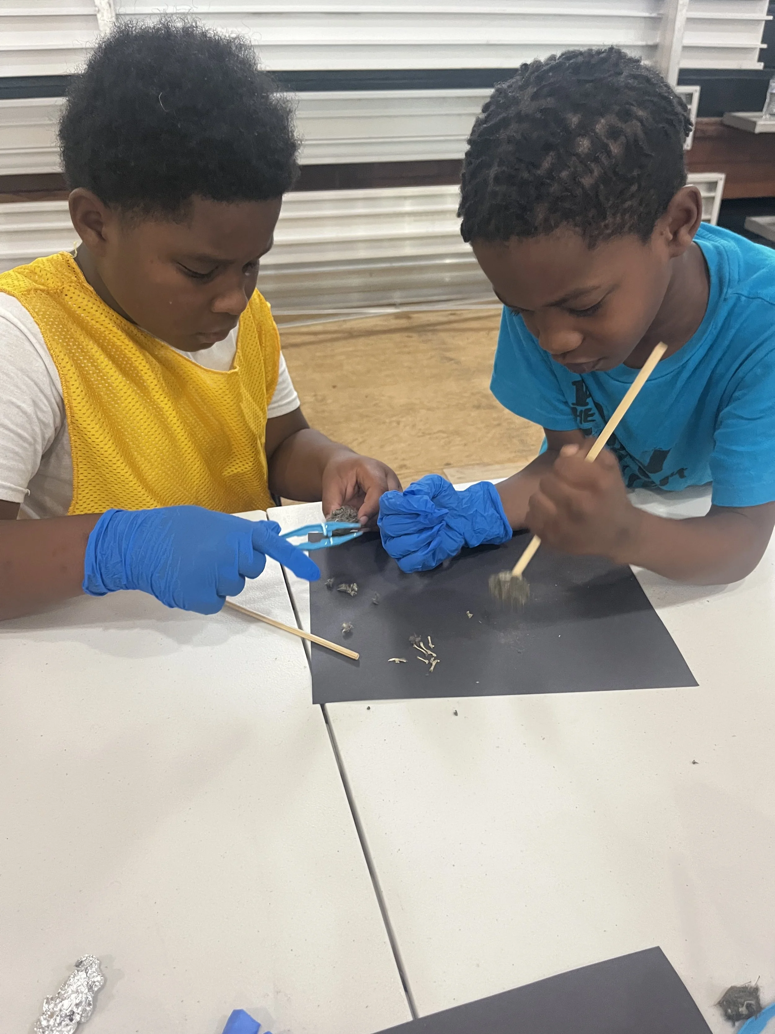 The kids dissect owl pellets with Professor Nadine McHenry.